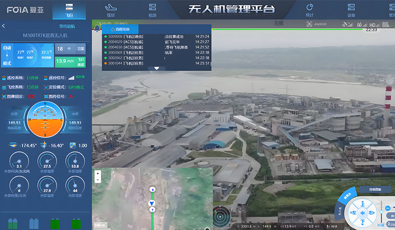 復亞智能智方A30無人機自動機場部署在化工園區樓頂,無人機搭載熱成像相機和喊話器,按照工作人員設定的飛行任務自動完成園區及周邊的巡邏工作。無人機通過自身攜帶的高清相機,對園區進行全天候、無死角監控,并將視頻實況直播傳輸至控制室的大屏上,所有信息一目了然,園區內一旦出現溫度異常、煙霧、明火、氣體泄漏等情況,將立即生成預警提示,上報給園區應急管理部門。同時,無人機對園區的出入口、應急車道、倉庫、禁區進行重點盤查,如有發現閑散人員闖入、車道隨意占用、人員聚集、不佩戴口罩等現象,工作人員可以在監控室內進行遠程喊話疏導,及時制止以上行為,為生產安全保駕護航。