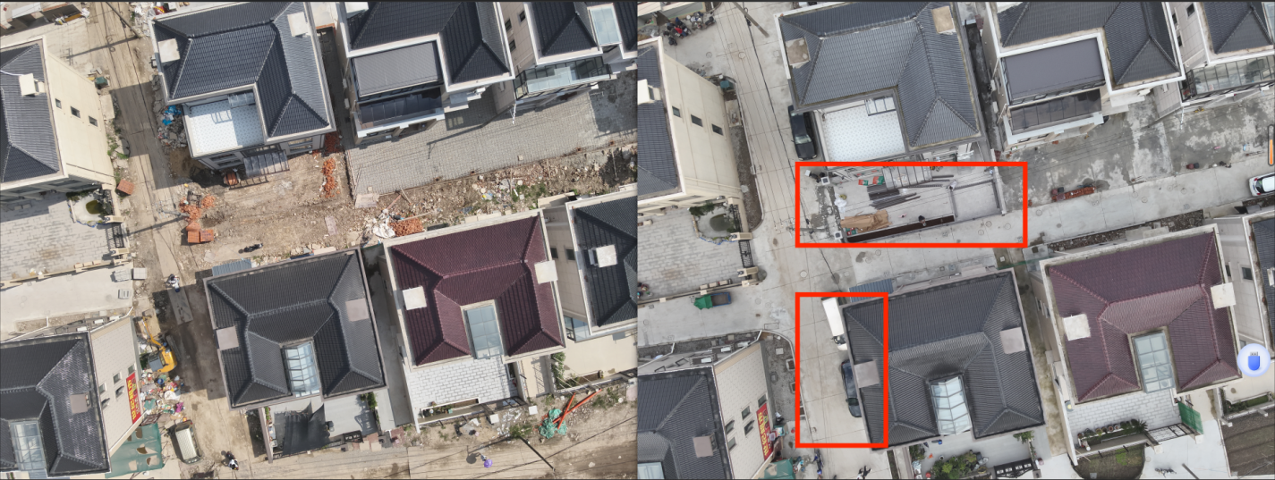 如上面對比圖所示,兩幅圖則為間隔多月的同一場景照片,第二張圖比第一張圖新建了私人住宅的圍墻和公路的電線桿,在下圖的點云視角后,圍墻和電線桿用紅色的點標記出來了。同時,用戶還可以根據需要調整對比內容的大小和范圍,提高識別的靈活性和準確性。